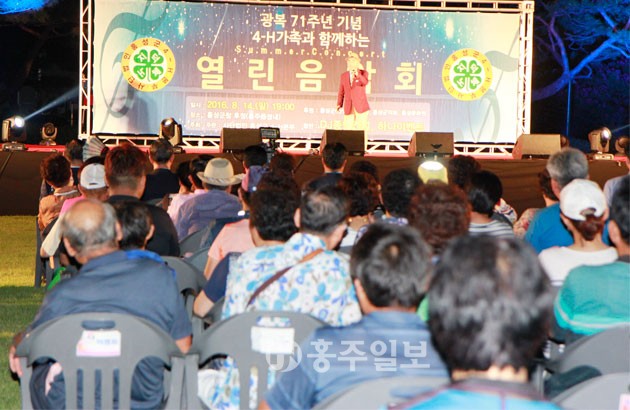 홍성군 4-H(본부회장 강현병) 가족과 함께하는 열린음악회가 지난 14일에는 홍성군청 후정에서 개최됐다. 이날 음악회는 김석환 군수, 홍문표 의원, 김덕배 의장, 오석범 홍주지명되찾기 범군민운동본부장, 윤길선 농업기술센터장을 비롯한 4-H 가족 및 군민 600여명이 참여했다. 이날 열린음악회는 가수 하이런의 사회로 정의송, 이수진, 한다성, 명국환, 안정애 등이 출현해 애향심 가득한 노래를 선보였다.