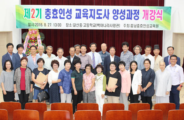충남충효인성교육원(원장 이병학, 이하 인성교육원) 충효인성교육지도사 양성과정 제2기가 지난달 27일 갈산 중·고등학교 백야나라사랑관에서 수강생을 비롯한 지역인사 60명이 참여한 가운데 개강식을 진행했다.<사진>