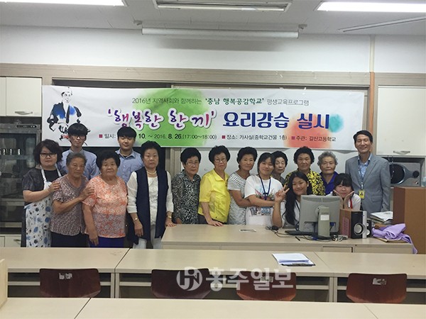 【갈산】 ‘충남행복공감학교’를 올해 4년째 운영하고 있는 갈산고등학교에서는 지난 6월부터 8월까지 3개월간 갈산면과 협조를 통해 학교 인근 지역의 저소득 독거노인을 대상으로 ‘행복한 한 끼’라는 지역사회 평생교육 요리 강습 프로그램을 운영했다. <사진>