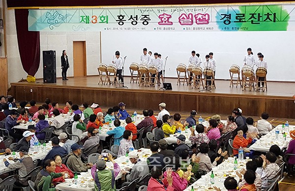 이날 경로잔치는 지난 2014년부터 운영되고 있는 행복공감학교 프로그램의 일환으로 진행된 것이며, 그간 홍성중의 발전을 위해 아낌없는 지원과 관심을 가져준 어르신들께 감사의 마음을 표현하는 장이 됐다.