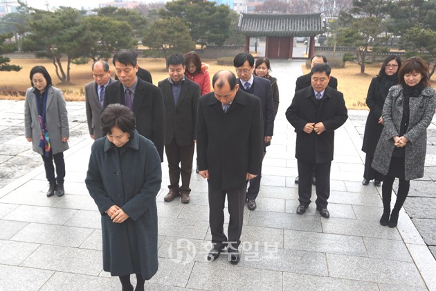 홍성교육지원청(교육장 고옥심)은 지난 2일 홍주의사총 및 충령사 참배를 시작으로 정유년 새해 업무를 시작했다. 이날 충령사 참배에는 홍성교육지원청 고옥심 교육장을 비롯해 간부공무원 14명 전원이 참석해 그 의미를 더했다.<사진>