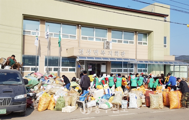결성면 새마을협의회(회장 방원식)는 지난달 28일, 29일 양일에 걸쳐 남·녀 새마을지도자, 결성농협 직원, 주민 등 100여명이 참여한 가운데 각 마을 내 숨겨진 고철, 의류, 폐지류, 빈병뿐 아니라 농업용 폐비닐, 농약병 등 농업용 폐기물을 수거했다.