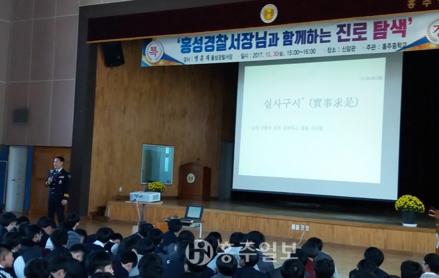 홍주중학교(교장 이원영)는 학생들의 진로 탐색을 위해 지난달 30일 맹훈재 홍성경찰서장을 초청, 생생한 현장 경험담을 듣는 뜻깊은 시간을 마련했다.