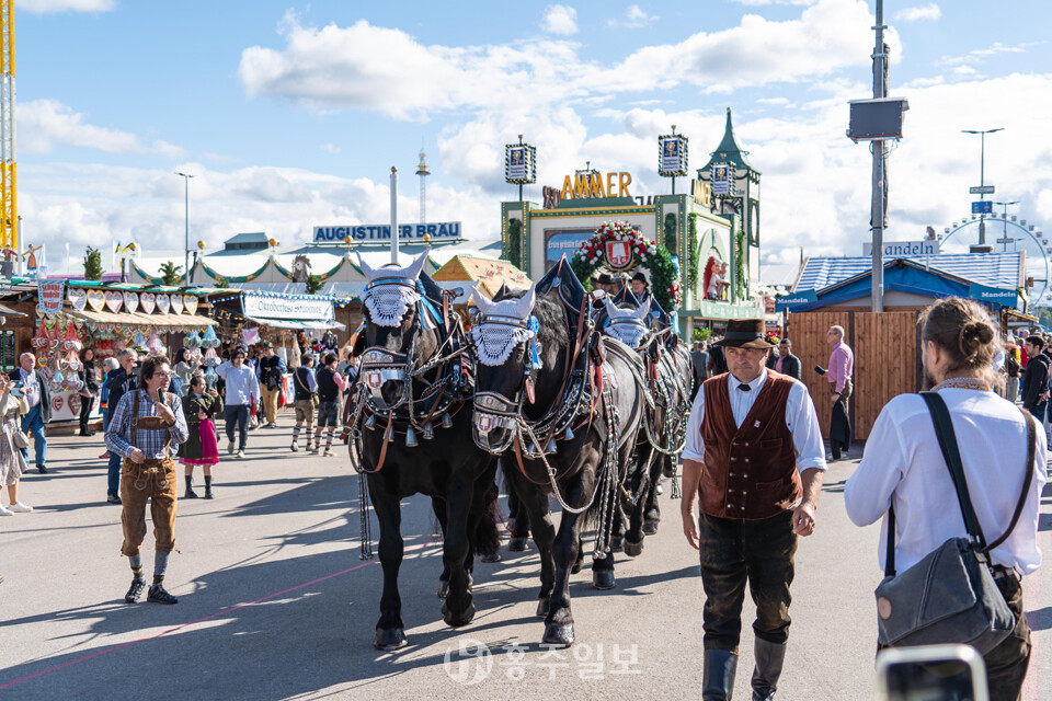 말들이 수많은 맥주 오크통이 담긴 마차를 끄는 모습은 인기 포토존이 되는 등 양조장들이 참여하는 맥주 마차 행렬도 축제의 하이라이트로 꼽힌다. 화려한 전통 복장을 입은 무용단과 음악단의 행진은 바이에른의 풍부한 문화를 보여준다.