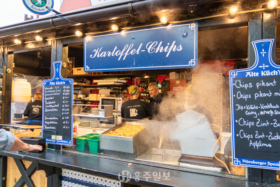 시장 한쪽에는 프랑켄 전통 먹거리를 파는 부스들은 열기를 더했다. 무엇보다 이 시기의 대표적인 계절 별미인 ‘페더바이저(Federweißer)’가 인기다. 이는 포도를 수확한 직후 발효시키기 시작한, 알코올 도수가 낮고 청량한 맛이 특징인 신 와인이다. 이 와인과 양파 타르트는 가을 마켓에서 반드시 맛봐야 할 메뉴로 손꼽힌다. 또한 시장에서는 구운 소시지, 생강 쿠키, 사과주스와 펀치 등도 판매되며, 뉘른베르크만의 지역 색을 고스란히 느낄 수 있다.