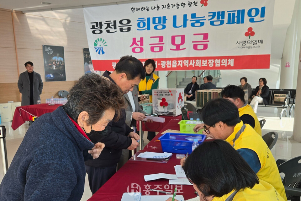 [홍주일보 홍성=김용환 인턴기자] 광천읍은 지난 10일, 광천문예회관 로비에서 열린 ‘희망2026 나눔캠페인 이웃사랑 성금’ 집중모금 행사를 따뜻한 관심 속에 성공적으로 마무리 하고, 주민 139명이 기탁한 3600여만 원의 성금을 충남사회복지공동모금회에 전달했다고 밝혔다.