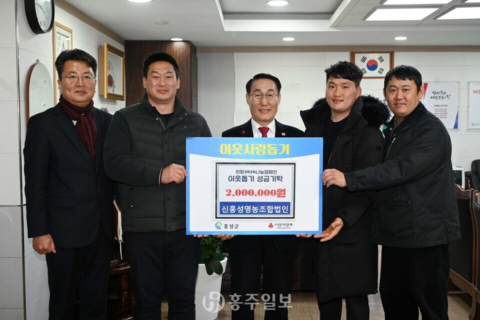 청년농업인 드론 방제단 ‘신홍성영농조합법인(대표 양봉규)’이 지난 23일 홍성군에 이웃사랑 성금 200만 원을 기탁했다.<사진>