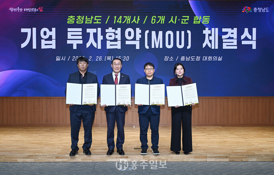 군에 따르면 이번 협약은 지난 26일 충남도청 대회의실에서 열린 합동 투자협약(MOU) 체결식에서 김태흠 충남도지사와 이용록 홍성군수, ㈜월산이앤씨와 ㈜탑바이오메디칼, ㈜수천중공업 기업 대표들이 참석한 가운데 합동으로 진행됐다.<사진>